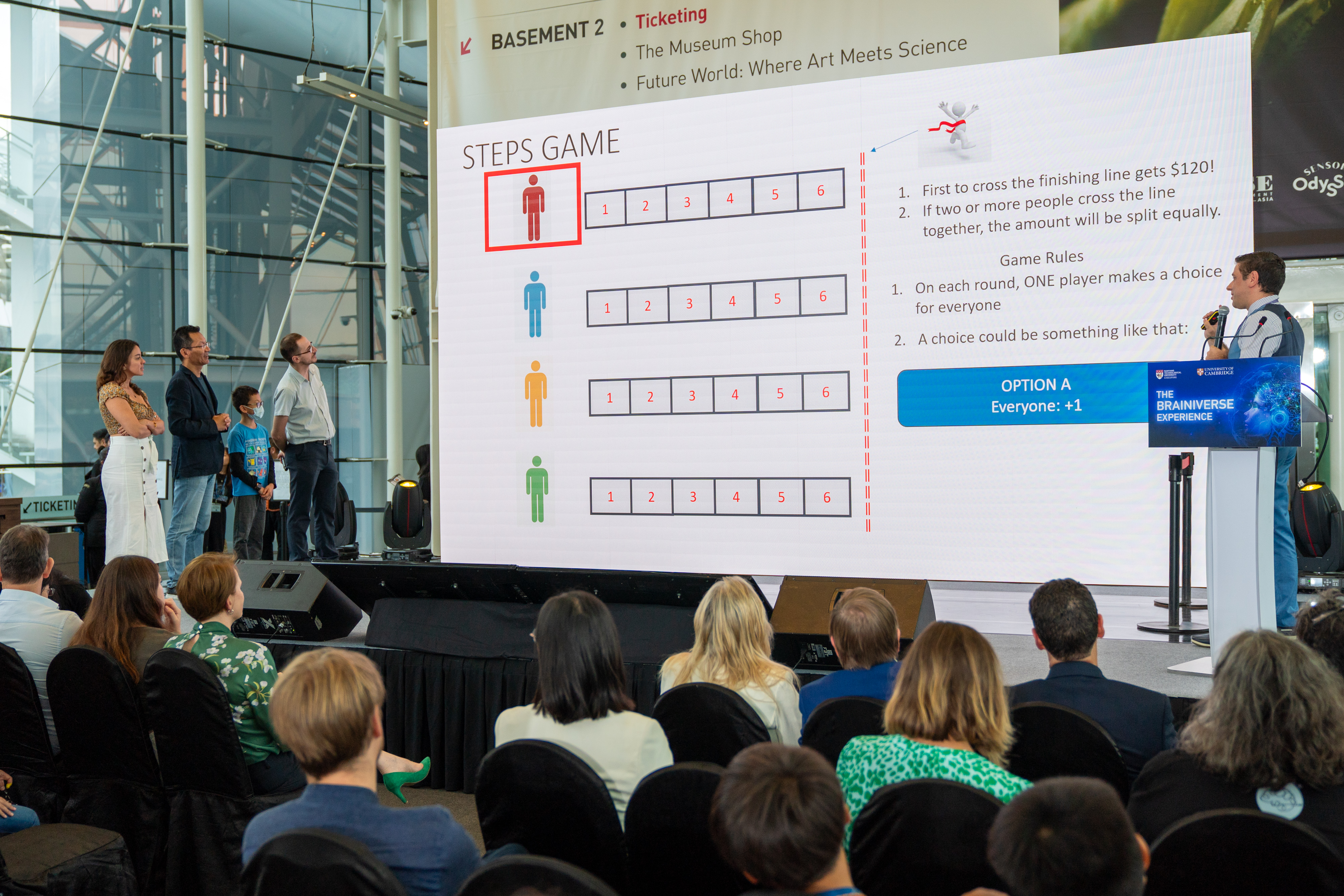 Amongst exciting public events such as the Brainiverse Challenge and dance performances, highlights from our lab include the gameshow “Brain Games: You, Yourself and Your Brain” hosted by Professor Georgios and our two booths, “Decision Den” and “Language Space”. Prof Georgios’s gameshow included a “Steps Game”, which engaged the audience by providing first-hand decision-making problems for participants to navigate. The Decision Den demonstrated decision-making processes by immersing participants in mind-boggling choice tasks. In Singapore’s vibrant multilingual culture, the Language Space booth proved to be popular. Attendees were introduced to the origins of language and explored different dialects in thrilling time-pressure games.
